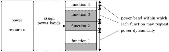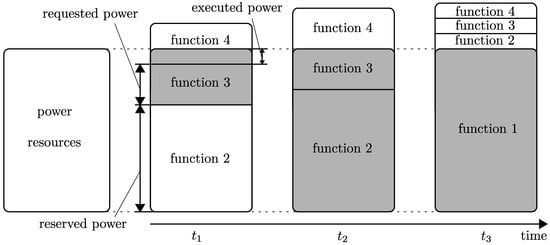 Besides the requested power, Section 2.1 lists the reservation of power resources in order to ensure that functions are capable of executing certain power increments at any time. Such a power reservation of a function results in a corresponding reservation of current reserves in the “power control” of Figure 4, which is defined by