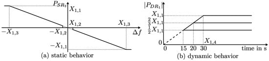 FCR is the first stage of the conventional load-frequency control. Following a difference between load and generation in the electric power grid, a frequency deviation in relation to the nominal frequency occurs. All technical entities which are providing FCR are taking part in stabilizing the grid frequency according to a droop control. According to the system operation guideline (SOGL) [34], which defines the regulatory requirements for FCR in Continental Europe, a full activation of FCR takes place in the case of a frequency deviation of 200 . A full activation equals a power output of the technical entity, which is identical to the corresponding tendered FCR-power. The full activation time after which such a full activation has to be reached is 30 following the occurrence of a frequency deviation. These requirements are illustrated in Figure 5, where the frequency deviation is calculated by