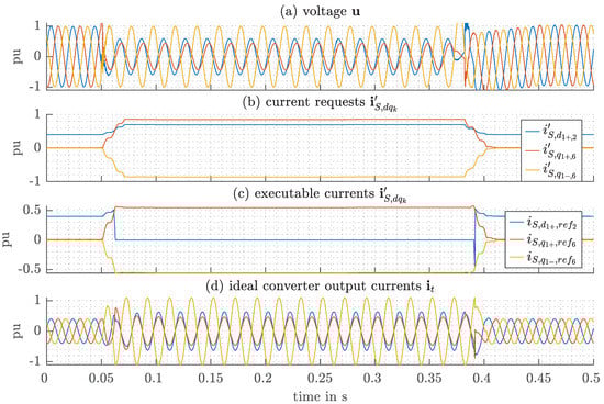 where the lower part of the equation corresponds to Equation (16) and leads to a current limitation of the current request of function . A detailed description of the calculation of this current limitation of Equation (24) is described in Section 2.3.1.