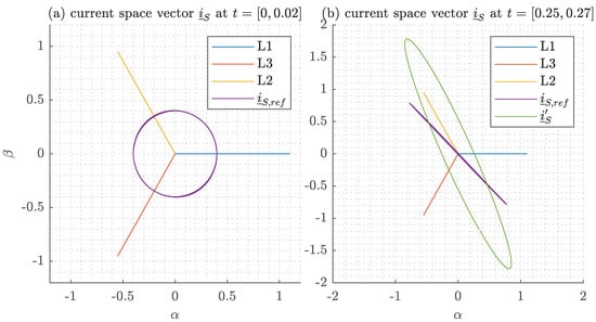 Assuming there is no zero-sequence system, the relationship between a current space vector in the -plane and a current space vector in the -plane is given by the Park-transformation