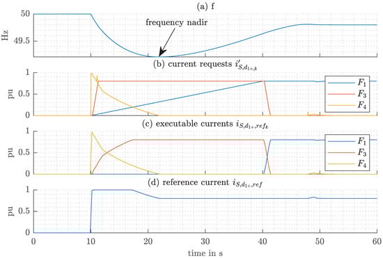 Figure 4 shows three different situations at the time , and , where the four functions are activated and have different requested powers for each situation. At the time function 1 and function 2 are inactive. However, for function 2 power resources are reserved according to the size of the allocated virtual BESS. Function 3 and function 4 are active and are using the remaining power resources. However, since the requested powers of all functions exceed the power resources there is a conflict of functions, which is resolved based on the priorities. Since function 3 has a higher priority than function 4, the requested power of function 3 can be fully executed, whereas the requested power output of function 4 is limited, leading to an executed power that is lower than the requested power. At the time function 2 fully exploits its allocated power resources and even requests a higher amount than reserved according to its virtual BESS. Due to the priorities, the power requests of function 4 cannot be executed any more and the function becomes inactive. At the time it is assumed that an abnormal grid condition leads to a power request of function 1 that fully exploits the whole power resources of the system. Due to the highest priority of function 1, requested powers of all other functions cannot be executed any more and power reservations are overruled. Therefore, the functions 2–4 become inactive.