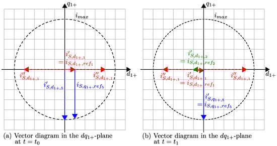For the calculation of of the function , a stepwise approach as described in [33] can be applied under the use of , where consists of fixed values of executable currents of functions with higher priority than the function and is to be calculated by the current limitation algorithm described in [33]. In a first step, a prioritization of the direct- or quadrature components of the function has to be defined. For the sake of simplicity, this prioritization is assumed for the quadrature components, identical as in [33]. Furthermore, it is assumed that the -component is zero. Taking into account these assumptions, the three remaining components , and can be calculated according to the Algorithm described in [33].