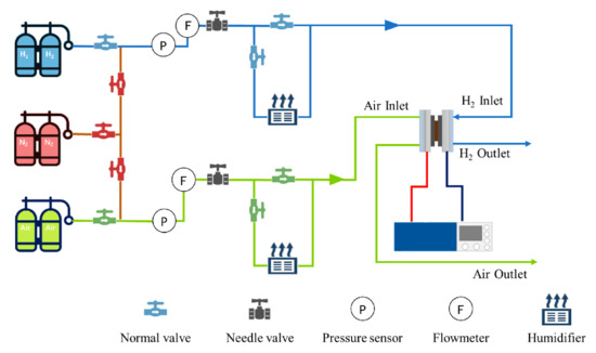 The reaction gas and the operating parameters such as backpressure, load, gas flow, and humidity of the PEMFC were controlled by the fuel cell test platform (PEMTest50, Hephas: Taiwan, China). Additionally, Figure 1 exhibited the schematic diagram of the test platform. The cold start experiment was carried out by using a climate chamber to simulate the subzero environment and the temperature range was −40–150 °C. To certify that the reaction gas temperature entering the fuel cell was consistent with the temperature set in the climate chamber, two 2 m cooling coils were added to the front end of the fuel cell in the climate chamber.