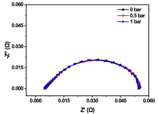 In this section, the relationship between back-pressure and the PEMFC property was investigated by adjusting the back-pressure valve of the test platform. The EIS of the PEMFC before the cold start was compared under different back-pressure, which was shown in Figure 3. The anode and cathode working back-pressure of the PEMFC were set to 0 bar, 0.5 bar, and 1 bar, respectively. The results suggested that the whole impedance curve shifted to the left with the enlargement of the back-pressure, and the impedance spectrum decreased with the increment of the back-pressure. The ohmic impedance of the MEA was 5.43 mΩ when both the anode and cathode back-pressure was 0 bar. When the back-pressure increased to 0.5 bar, the ohmic impedance decreased to 4.96 mΩ, while the ohmic impedance was the smallest at 1 bar, which was 4.63 mΩ. As the ohmic impedance was related to the water content in the proton exchange membrane (PEM), the ohmic impedance decreased, indicating that the water content of the PEM increased. Therefore, increasing the back-pressure could promote the movement of the gas perpendicular to the flow channel and be beneficial to the improvement of fuel cell property.