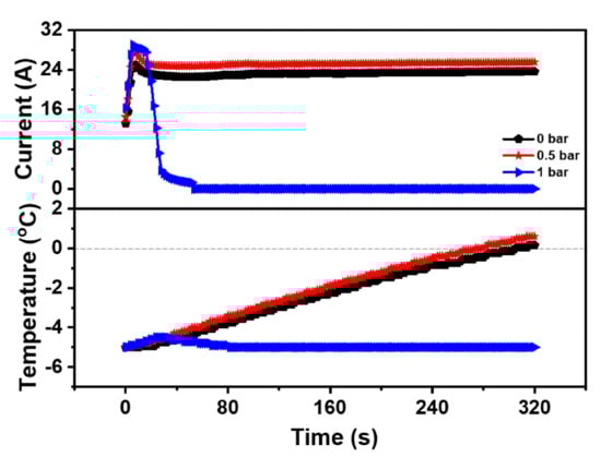 To further explore the impact of back-pressure on the cold start property of the PEMFC, Case 1, Case 6, and Case 7 were selected as experimental operation parameters, as shown in Table 4. Additionally, the curve of the current and temperature of the PEMFC during the cold start-up process under different back-pressures was shown in Figure 4. Under the temperature of −5 °C, the start-up time of the PEMFC at 0 bar was 305.5 s with a peak current of 24.99 A. Meanwhile, the start-up time of the PEMFC at 0.5 bar was 274.0 s with a peak current of 27.53 A, indicating that the reaction rate of the PEMFC could be enhanced by appropriately increasing the back-pressure, which could increase the current of the PEMFC at the same working voltage. Therefore, the cold start-up speed of the PEMFC was accelerated. However, the cold start of the PEMFC failed at 1 bar even though the peak current reached 29.06 A, which was the highest among these three cases. The reason might be that high current produced more water, while high back-pressure reduced the gas flow, making it difficult to eject the generated water. Moreover, the accumulated water led to flooding inside the PEMFC, which prevented the electrochemical reaction. As a result, the heat generated could not meet the requirements of the cold start, which caused the freezing of the MEA. Therefore, the back-pressure could enhance the cold start property of the PEMFC, but excessive back-pressure could also be detrimental to the cold start property of the PEMFC. According to the above analysis, the anode and cathode back-pressure of the PEMFC was both set to 0.5 bar to ensure the best cold start-up property of the PEMFC at low temperature.