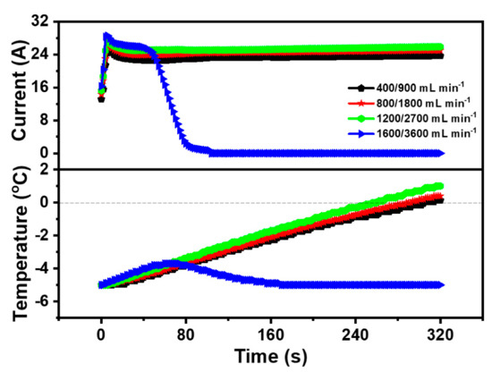 To survey the impact of inlet gas flow rate on the cold start property of the PEMFC, the anode and cathode gas flow rates of the PEMFC were set to 400 mL·min−1 and 900 mL·min−1, 800 mL·min−1 and 1800 mL·min−1, 1200 mL·min−1 and 2700 mL·min−1, and 1600 mL·min−1 and 3600 mL·min−1, respectively. Case 1, Case 8, Case 9, and Case 10 were the experimental operating parameters, which were shown in Table 4. Additionally, the impact of different inlet gas flow on the cold start property of the PEMFC was revealed in Figure 5 with the gas flow rate mentioned above. It was obvious that the peak current of Case 1, Case 8, Case 9, and Case 10 was 24.99 A, 25.91 A, 27.46 A, and 28.54 A respectively, which means the electrochemical reaction could be accelerated by increasing the gas flow rate of the PEMFC. Among these four cases, Case 1 (400 mL·min−1 and 900 mL·min−1), Case 8 (800 mL·min−1 and 1800 mL·min−1), and Case 9 (1200 mL·min−1 and 2700 mL·min−1) were successfully started at the low temperature and the required start-up time was 305.5 s, 291.3 s, and 257.4 s, respectively. In other words, the cold start time of the PEMFC was shortened and the cold start property of the PEMFC was improved after increasing the inlet gas flow rate. The results could be declared that the increase of the inlet gas flow rate could enhance the supply of the reaction gas, accelerate the movement of the reaction gas, and increase the current of the PEMFC [31]. Meanwhile, a higher current could provide more heat to the PEMFC cold start. On the other hand, the gas velocity in the flow channel raised with a large gas flow rate, and the produced water in the PEMFC could be brought out by the high-speed gas, preventing the CL and the GDL covered by ice and ensuring the smooth transmission of the reaction gas. However, the impact of the factor on the cold start property of the PEMFC was limited. When the anode and cathode gas flow rate of the PEMFC enlarged to 1600 mL·min−1 and 3600 mL·min−1, the cold start of the PEMFC failed. Although electrochemical reactions of the PEMFC occurred rapidly at a high gas flow rate, it was difficult for the PEMFC to maintain the temperature rise due to high gas velocity and rapid heat loss. Hence, the produced water was frozen without enough heat, which coated the CL and GDL, impeding the transfer of the reaction gas and the electrochemical reaction. Based on the experimental results in Figure 5, the anode and cathode inlet gas flow rates of the PEMFC were 1200 mL·min−1 and 2700 mL·min−1.