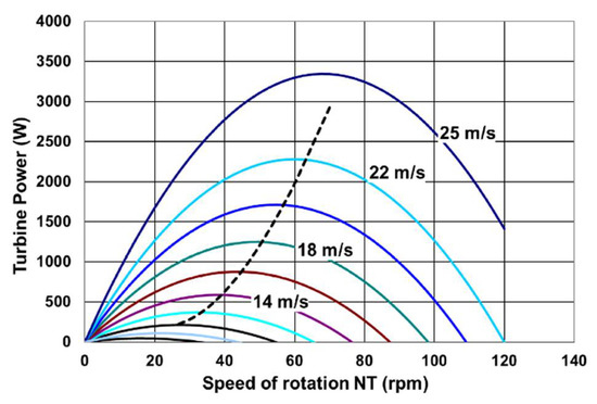 Unlike horizontal axis turbines, the torque value is particularly high when the turbine starts, and it decreases when the rotation speed rises. A more classical bell-shaped curve is observed for power characteristic. One of the main purposes of the energy conversion system, associated with the turbine, will therefore be to keep its working point as close as possible to the maximum power points (dotted curve in Figure 3).