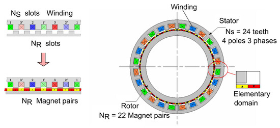 In the PMVM, the tooth pitch is nearly equal to mechanical pitch, defined as the angle covered during an electric period. The number of rotor magnet pairs NR is different from the number of stator teeth NS. The condition to be met is: