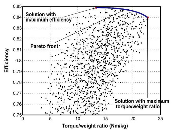 Using (18), we calculate that a machine with a power factor of 0.928, a rated power of 1.5 kW, and a rated voltage of 120 V, would have a rated current of 4.5 A, but its stator current would reach 7.5 A at the working point. So as to not oversize the machine, among the solutions calculated in Table 1, we seek the solution that represents the best compromise between efficiency and power factor while maintaining a high torque to weight ratio (Figure 21).