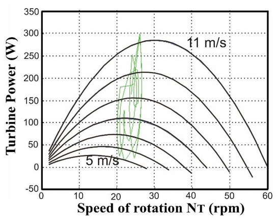 To illustrate what happens under high wind speed conditions, we use a wind profile with the same shape as that in Figure 8, but with a mean value of 19 m/s, that is, the wind speed with which we determined the rated values. With a DC-link voltage of 48 V, which is the optimal value for an average wind speed of 8 m/s, the working point trajectory of the resulting turbine is shown in Figure 17, and the energy collected on the DC-link is divided by more than four compared to the energy produced with a PWM rectifier (Figure 18).