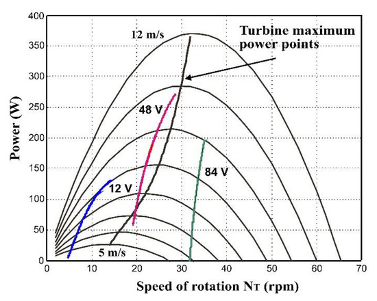 If we may vary the DC bus voltage, we can improve the operation of the energy conversion system with a diode bridge, by adapting this voltage to the rotating speed. However, this solution reduces simplicity, sturdiness, and does not bring significant improvement in power production. If we apply (18) with a voltage UDC = 96 V, the power is about 470 W, which is much lower than the 1470 W that the turbine can potentially produce when the wind reaches 19 m/s.