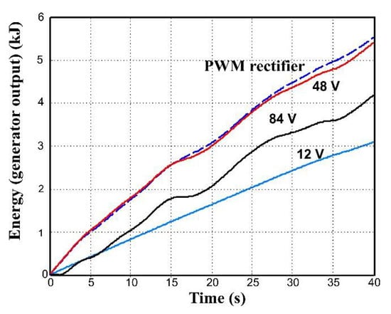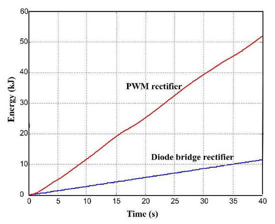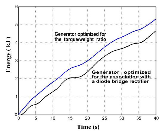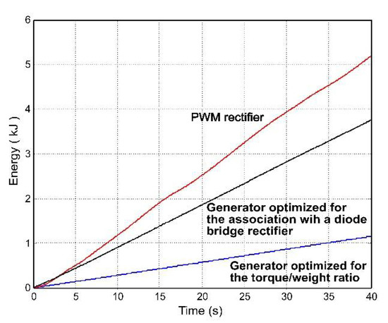 The energy at the generator output, despite being 30% lower than with a PWM rectifier, represents three times the energy we can obtain with a high torque/weight generator associated with a diode bridge (Figure 24).