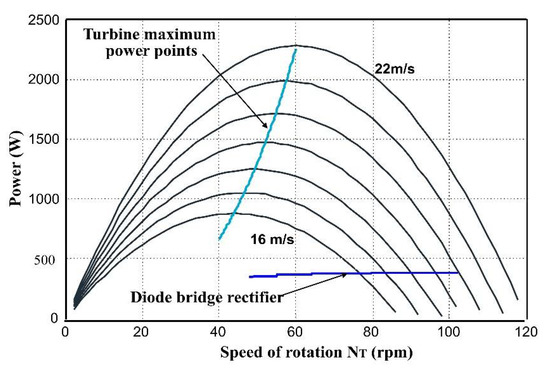 Using (18) and (20), we can plot the evolution of the maximum power versus speed produced by the association of the generator and the diode bridge rectifier. Figure 19 is obtained by using this plot and the characteristic giving the maximum power produced by the turbine versus speed.