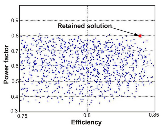 Power factor of feasible solutions versus efficiency.