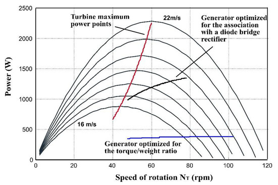 With a wind profile centered on 19 m/s, the generator optimized for the diode bridge makes it possible to obtain working points nearer the maximal power points than with the machine with a high torque-to-weight ratio (Figure 23).