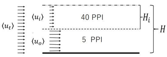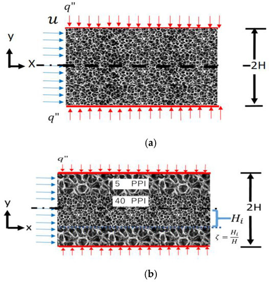 The height of the studied channel is 2H in which a laminar, steady and incompressible flow exists. Air is accepted as a working fluid and the bottom and upper walls are subjected to the identical constant heat flux. The studied cases include (a) channel filled with a uniform aluminum foam (Figure 1a,b) that consists of two layers of aluminum foam with two different PPI values (Figure 1b).