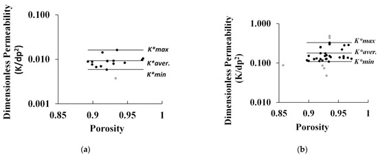 The change of dimensionless permeability with respect to porosity for aluminum foams, (a) 5 PPI, (b) 40 PPI, (Discarded values are shown by grey color).