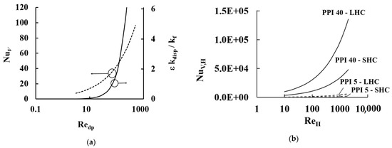 As it was mentioned before, and are the effective thermal conductivity of the fluid and solid phases while is clear fluid phase thermal conductivity, and represents the channel-based volumetric interfacial heat transfer coefficient. The expression for is found by substituting Equation (17) into Equation (15):