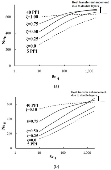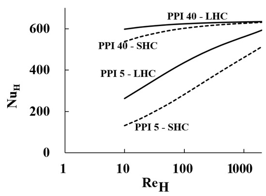 The same comments are valid for the SHC however the critical channel Reynolds number for better thermal performance of the two-layer channel compared to the uniform single layer with 40 PPI occurs around = 1000 (Figure 10b). As it can be seen from Figure 5b the difference between the of 5 PPI and 40 PPI is very small. The increase in velocity at the outer region causes small changes in the value of and consequently after = 1000, the thermal performance of two-layer metal foams become better.