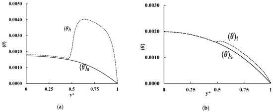 It should be mentioned that and are effective thermal conductivity of the solid phase for the outer and inner regions, respectively, while and are effective thermal conductivity of fluid phase for the outer and inner regions, respectively. The interface temperatures can be found by using above equations. Taking a derivative from the temperature equations of the solid and fluid phases of the inner and outer regions (Equations (42)–(45)) and substituting into the above equations yields the interface temperature for solid and fluid phases. After doing the necessary mathematical calculations, two equations with two unknowns which are and are obtained for the interface temperature: