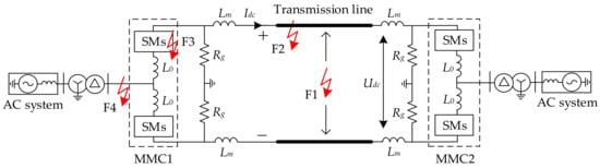 Limited by the compactness, lightness, and capital cost requirements of the converter station, the symmetrical monopole MMC-HVDC system has a good application prospect. Both domestic and many foreign MMC-HVDC projects have adopted symmetrical monopole converter stations [34,35]. The research in this paper is based on a symmetrical monopole MMC-HVDC system, as shown in Figure 1. The converter stations serve as an interface between DC and AC systems. The half-bridge SM is commonly used in recent MMC projects [36,37]. The work of this paper is based on half-bridge MMC, and the number of SMs of each bridge arm is n. The DC side of the converter is grounded through a large resistor Rg and the neutral point is grounded. The bridge arm reactor L0 can inhibit the interphase circulation current, reduce the bridge arm current’s harmonic distortion rate, and suppress the fault current to protect equipment. Lm is a current-limiting reactor, which can effectively reduce the rate of change of the fault current after the DC line fault and leave more time for the protection of the DC line and the action of the DC circuit breaker. The DC current Idc in the transmission line is measured at the point between the transmission line and the current-limiting reactor. In this paper, the transient states to be considered for protection include PPFs located at F1, PGFs, lightning disturbances (LDs), and lightning faults (LFs) located at F2, SMs short circuit faults (SMFs) on the arm of a phase located at F3, and single-phase grounding AC faults (AG-ACs) located at F4.