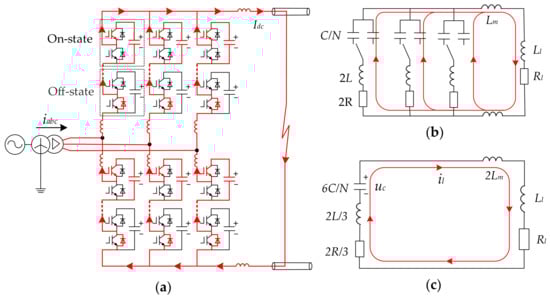 When a PPF occurs in an MMC-HVDC system, which is located at F1 in Figure 1, the fault process can be divided into three stages: the unblocked SM stage, the initial stage after the SM is blocked, and the steady stage after the SM is blocked. In order to detect a fault in a short time, it is necessary to use transient information at the beginning of the fault. Therefore, the fault transient process studied in this paper mainly focuses on the unblocked SM stage. The equivalent circuit of the unblocked SM stage is shown in Figure 3. The fault current Idc is mainly composed of the SM capacitor discharging current and AC source feeding the current. During this stage, SMs are switched to the normal operation mode, which means a total of n SMs of each phase unit are in the on-state at any time to maintain the DC bus voltage. Due to the SM capacitance voltage balance control principle, SMs are switched on and off sequentially in a short time frame. All SMs in each phase can be divided into two groups, and discharge alternately, as shown in Figure 3b. Because of the high control frequency, it can be approximated that the two groups of SMs alternately discharged are in parallel in each phase. Therefore, it can be equivalent to a second order RLC discharging circuit, as shown in Figure 3c.