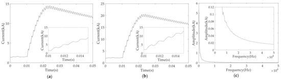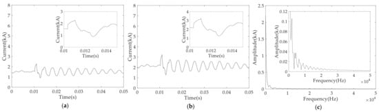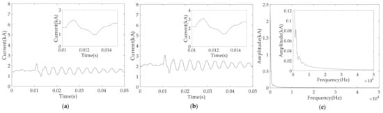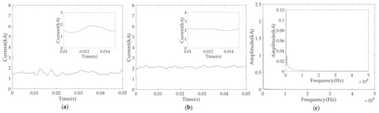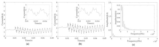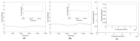 Here, t0 is the moment of insulation breakdown, after which the LD evolves into an LF. The LF transient characteristics of Idc are shown in Figure 8. The frequency spectrum of LF looks similar to that of LD in Figure 7c. However, they are different. Due to the superposition of GF, whose energy is focused in the low-frequency band, the energy spectrum of LF reveals the features of both GF and LD. As demonstrated in Figure 8c, most energy is concentrated in the range from 0 to 30 kHz. The energy decreases gradually beyond 30 kHz. Although more harmonic-like energies are included in the frequency from around 15 to 50 kHz, less steepness is shown in LF than that in LD.