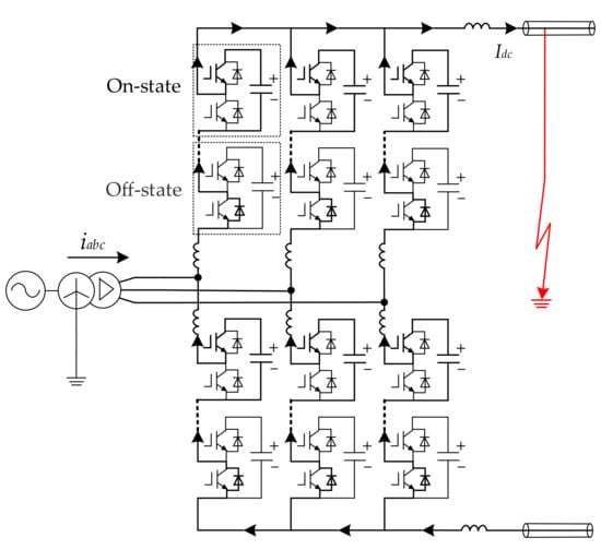 The characteristics of a PGF of MMC-HVDC are different from either traditional LCC-based HVDC converters or two-level VSC-based converters. When the PGF occurs at the location F2 in Figure 1, no closed loop can be formed between the faulted point and the SM capacitors. Only a slight transient signal is produced due to the deceasing bus potential of the faulted line. The capacitor will not discharge. Figure 5 illustrates the corresponding equivalent circuit. Therefore, the average SM capacitor voltage remains the same, and the DC voltage between two poles will be unchanged. The fault pole voltage becomes 0. There is no steady-state fault current in the DC line.