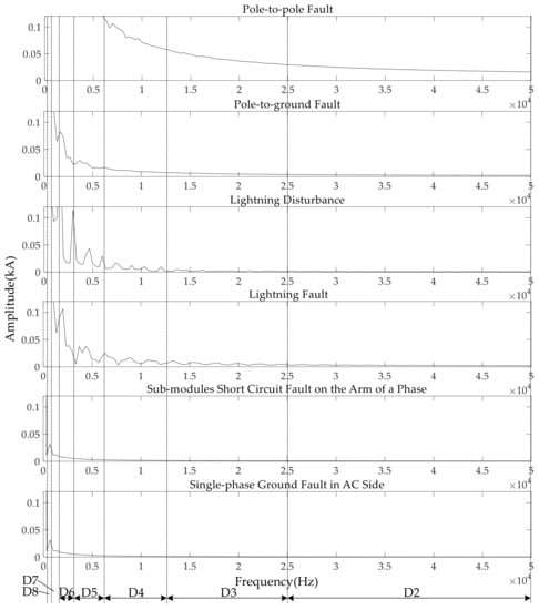 In MMC-HVDC systems, to ensure protection speed and sensitivity, the sampling frequency of the protection device is required to be no less than 50 kHz; a short time window requires a high sampling frequency to increase the acquisition of transient information. In most engineering applications, the sampling frequency is set as 100 kHz [17,18,20], and the largest is 1 MHz [22]. In this work, we choose 200 kHz as the sampling frequency. Then, the signal is decomposed by wavelet transform. Figure 11 shows the energy distribution of different wavelet frequency bands. Through spectrum analysis, there is a small amount of content of different frequencies from 50 to 100 kHz of various faults, and the change is insignificant. Therefore, the spectrum display range is from 0 to 50 kHz in this case. There are clear differences in the frequency spectrum of different faults in different frequency bands; in particular, the degrees of frequency fluctuation and disorder are different. For example, on the fourth level in the spectrum from 6250 Hz (200 kHz/24+1) to 12,500 Hz (200 kHz/24), the differences between the content of different frequencies of lightning strikes are larger than the PGF. These characteristics can be characterized by entropy.