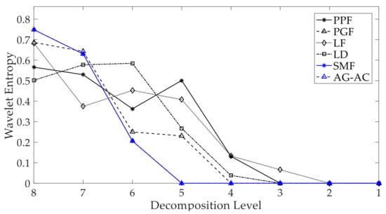 The wavelet entropy of each wavelet decomposition level indicates the degree of confusion of the detailed coefficients of the corresponding frequency band. From Figure 11 and Figure 12, it can be seen that the amplitude and variation of the spectrum from 3125 Hz (200 kHz/25+1) to 50 kHz (200 kHz/22) of SMF and AG-AC are small. The wavelet entropy of the 2nd to 5th levels are all 0. This means that after filtering by the boundary, from the fifth to the first level, the differences between the content of different frequencies are too small that the calculated entropy value is 0. Its energy is mainly concentrated in the low-frequency band. The amplitude and change in the frequency spectrum of PGF are close to zero from 6250 Hz (200 kHz/24+1) to 50 kHz (200 kHz/22). The wavelet entropies of the 2nd to 4th levels are all 0. This means that its transient signal energy and changes are mainly concentrated in the mid-frequency and low-frequency parts. From 12,500 Hz (200 kHz/23+1) to 50 kHz (200 kHz/22), the amplitude and change of the frequency spectrum of LD are also small. Its wavelet entropy of the 2nd to 3rd levels is 0. Thus, its transient signal energy and changes are concentrated in the mid-frequency and high-frequency parts. The frequency spectrum of LF is close to zero from 25,000 Hz (200 kHz/22+1) to 50,000 Hz (200 kHz/22). Its wavelet entropy of the 2nd is 0. Its transient signal energy and changes still exist in the high-frequency part. The wavelet entropies of PPF, from the 4th to 8th levels, are relatively large. This indicates that the content of each frequency band changes uniformly.