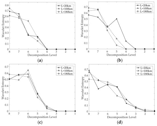 Figure 13 shows the distribution of wavelet entropy when the internal fault occurs in different locations. The faults are located at 20, 100, and 180 km along the line. As shown in Figure 13a, at different fault distances, the wavelet entropies of the 2nd to 4th levels are 0. From the 6th to 8th level, the wavelet entropies have some fluctuations. In Figure 13b, from the 5th to 8th level, the wavelet entropies have some fluctuations, but they are larger than 0 and are different from external faults. In Figure 13c, the values of the 2nd to 3rd levels are 0, the entropy of each level changes insignificantly, and the overall trend is consistent. In Figure 13d, the values of the 3rd level are larger than zero and different from LDs. Fluctuations are mainly concentrated from levels 5 to 8. Although the wavelet entropy changes under some decomposition levels, the overall distributions of wavelet entropy under different propagation distances are similar.