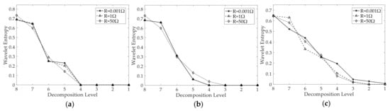 The ground resistor affects the sensitivity of the protection. An excessively large ground resistor may make the transient characteristics of the fault unobvious and cause the protection to fail. Figure 14 shows the distribution of wavelet entropy when the internal fault occurs with different ground resistors. The resistances of the ground resistor studied in this section are 0.001, 1, and 50 Ω. They are located at 100 km of the overhead lines. Figure 14a shows entropies of PGF; the values of the 2nd to 4th levels are 0. The trend of wavelet entropy changes is predominantly the same, and excessive resistor has little effect on the entropy. Figure 14b shows entropies of PPF; the values of the 5th level are larger than 0, are different from the external faults, and all values fluctuates slightly. Figure 14c shows entropies of LF; the wavelet entropy of each level fluctuates slightly, but the trend is the same. The values of the 3rd level are larger than 0 as well, and different from the LDs. Although the wavelet entropy has small numerical changes in some levels, the value has a small difference, and its overall distribution is the same.