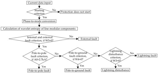 Combined with the above analysis, the protection scheme is designed as shown in Figure 15. Firstly, the current value is detected to determine whether the protection system is activated or not. Then, the wavelet entropy of the line mode component is calculated and used to determine its fault zone based on the internal and external fault criterion. If it is an internal fault, the fault will be judged according to the PPF criterion, PGF criterion, and LD criterion in turn. Finally, the fault type is given.