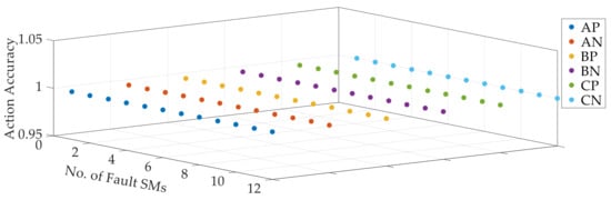 The number of faulted SMs will affect the value and change of the short circuit current in DC transmission lines. It is necessary to study the effect of the number of fault SMs. Here, the performance of the proposed protection method is discussed as the number of fault SMs ranges from 1 to 12. The 5th level wavelet entropy W5 of fault current Idc is always 0, which is obviously different from the case of an internal fault. It meets the internal and external fault criterion and is judged to be an external fault. As shown in Figure 16, the accuracy of the protection actions of different kinds of faults are all 100%, no matter how many SMs are faulted. Here, AP, AN, BP, BN, CP, and CN represent the upper (positive) and lower (negative) bridge arms of the ABC three-phase in the MMC converter, respectively. The change in the number of fault SMs will not affect the action of the protection criterion.