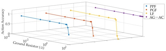 A different ground resistor has an effect on the magnitude of transient signals, which will affect the accuracy of the protection actions. Here, the performance of the proposed method in dealing with PPF, PGF, LF, and AG-AC is discussed. Figure 17 shows the influence of the ground resistor on the action accuracy. As demonstrated by Figure 17, when the ground resistor is smaller than 50 Ω, the proposed method is immune to the change in ground resistor. However, with the increase in ground resistor, the fluctuation of high-frequency components of the transient currents becomes less obvious, which mean less disorder in high-frequency bands, and decreases. For internal faults, the values of W4 and W3 will decrease, and misoperations of protection will be found. However, for external faults, such as AG-AC, the criterion W5 = 0 is not affected. The judgment of external faults is still effective.