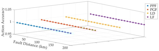 The fault distance will affect the sensitivity of the protection scheme. It is necessary to study the effect of different fault distances for PPF, PGF, LD, and LF in this work. The action accuracy of the protection scheme when different faults occur at different positions is shown in Figure 18. When internal faults occur at different distances, the inequality W5 > 0 is always true. Under different internal faults, the values of A0, W4, and W3 are respectively in accordance with different fault type criterions. The fault types can be distinguished effectively without being affected by the fault distance. The results show the proposed wavelet entropy-based method is immune to the variation of fault distance.