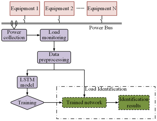 In NILM, the power data collected from the main distribution line is a kind of time series data. The associated LSTM model can effectively establish internal correlation based on the characteristics of the power load data, so as to realize the identification of the power load. The LSTM deep learning algorithm learns the rules and characteristics by training a large number of data samples, with an entire framework as shown in Figure 1.
