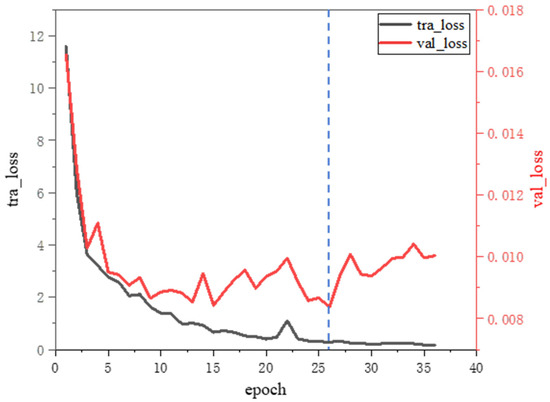 Because of the early stopping method, the training time was greatly shortened. The training period set in the experiment was 50 times, and the patience value of the early stopping method was 10 times. At the same time, each experiment was repeated 5 times, and the results were averaged. For example, in Figure 4, it shows the image of training loss (tra_loss) and validation loss (val_loss) of the washing machine training with epoch. We observed that a model that was supposed to be trained 50 times stopped at 26 times. Because the validation loss is no longer reduced within the patience value range, the training is stopped early, which shortens the training time and improves efficiency.