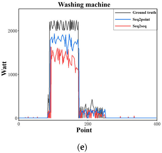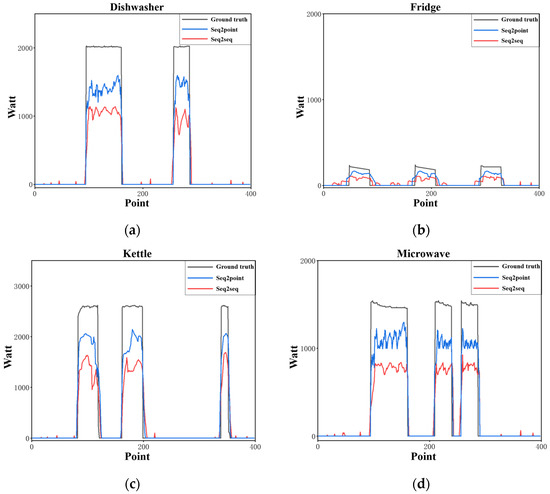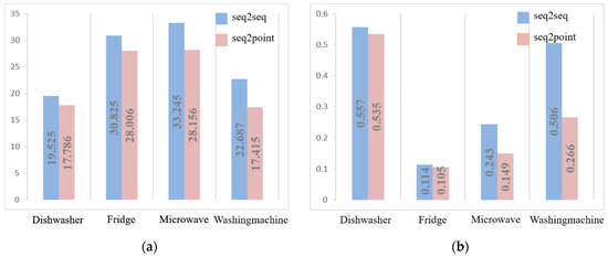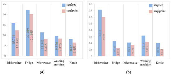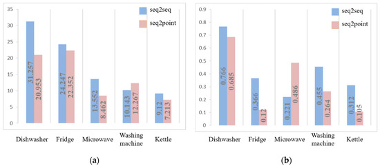 Secondly, for the REDD dataset, Figure 6 shows that our new model improved MAE by about 14% and SAE by about 24%, which showed an optimization effect on seq2point that was better than that on seq2seq. Different from the UK-DALE dataset, the identification effect of the five electrical appliances has been improved to a certain extent. Due to the increase in the number of houses, the identification effect of the washing machine was improved to a certain extent. The reason also includes the increase in the number of brands of electrical appliances. Hence, our conjecture is confirmed.
