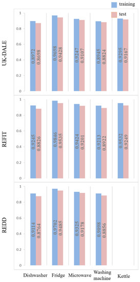 Additionally, it is very important to apply the new model to the houses not participating in the training, so as to test recognition ability. This is the only way to verify the generalization performance of the model. Generally for a deep learning model, the more data used in training and a wider source should lead to a better generalization performance of the model. It is presented that the F-score of the test set is similar to that of the training set in Figure 9. The identification effect of the REFIT dataset is better than the other two datasets, which coincides with the previous viewpoint. When the collected data types are similar, the recognition effect is good. Hence, it is required that the data in certain types are applied in the model. In summary, the results show that the model in this paper has a strong generalization ability, even with a better load identification performance in completely unfamiliar families.