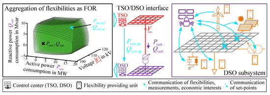 In the recent years the ENTSO-E [4,5,6,7,8] and Cigré [9] are focused increasingly on the topic of TSO/DSO cooperation to provide a maximum of assured flexibility potentials from the distribution to the transmission system level. Thereby, the first step is to include the distributed flexibility potentials at the day-ahead or intraday operational planning of the TSO while avoiding a conflicting or counter-acting use of flexibilities. For this vertical supply of ancillary services, a suitable multi-voltage-level grid control concept needs to be developed, defining the interactions and communication between the TSO and DSO. Hierarchical grid control concepts are an opportunity besides currently not achievable central or fully-distributed grid control concepts (e.g., system operator responsibilities, regulatory frameworks, big data, privacy aspects, ICT integration). A taxonomy and overview of hierarchical, also known as vertical-distributed, TSO/DSO coordination schemes are provided in [10,11], respectively. Hierarchical grid control concepts consider the conventional separation of the operational management of the system operators [12]. TSO/DSO interactions are based on a feasible operation region (FOR) (see left side of Figure 1, also known as active and reactive power (PQ) flexibility area, equivalent PQ-capability, PQ-flexibility map), which represents the aggregated flexibility potentials for the adaptation of the vertical active and reactive power flows (, ) at the TSO/DSO interconnections [13]. The FOR is determined by the DSO under consideration of the current grid state to guarantee a compliance of technical constraints (e.g., voltage limits, thermal capacity of lines and transformers). Operational degrees of freedom are flexibility providing units (FPU, see right side of Figure 1) of the DSO (e.g., on-load tap changing (OLTC) transformer, compensation systems) as well as distributed flexibility potentials (e.g., controllable loads, DER). The FOR can be integrated in the operational management of the TSO as an additional reactive and active power flexibility while the compliance of a certain set-point (, ) and the coordination of the distributed flexibility supply are performed by the DSO [14]. Thereby, the complexity of multi-voltage-level grid control is reduced and the individual interests of the DSO and the stakeholder of the FPU can be considered, e.g., by a monetarization of the FOR area.