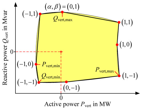 The FOR represents the possible adjustment of the active and reactive vertical power flows (, ) at the present operating point (see Figure 1). The FOR can be described by an approximated polygonal area in the PQ-plane (see Figure 1) neglecting voltage variations at the interconnection bus. The vertices and their order need to be specified for the description of a polygon. This procedure is called sampling [21]. The determination of the edges of the FOR can be formulated as an optimization problem according to the optimal power flow problem [33]. The objective function F of the optimization problem is given by [34,35]: