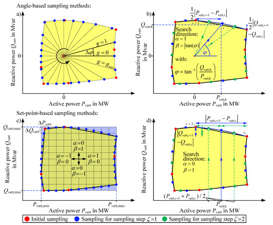 Further sampling strategies for the estimation of the FOR which are applicable for any common description of the OPF are introduced in [26]. Thereby, the authors identify the independence of the OPF description from any specific sampling strategy. The sampling of the FOR edges is emphasized, instead of calculating numerous points inside and on the edges by individual OPF. This results in lower computation times while neglecting meta information (e.g., cost structure). There is still the possibility to identify the reason for the limitation of the FOR (e.g., by voltage or current constraints) by sampling the edges of the FOR. A comparison of the computation time or the quality of the results to other sampling strategies for a specific OPF description is not included. One of the developed sampling strategies is used in [27] to investigate the effects of distribution system characteristics (e.g., switching status, impedances, voltage and current constraints) on the FOR.