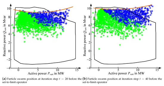 The PSO adapts the swarm behavior of animals (e.g., birds foraging) to find the minimum value of the objective function based on communication and individual experience of the n swarm particles (cf. [30]). The search behavior of the swarm within the -dimensional search space is described by the position and velocity matrices and , where k is the number of buses. The position of a particle p represents a specific set of the operational degrees of freedom within the limits of their lower boundary and upper boundary (see Equation (12). The velocity of a swarm particle describes the change of the flexibility utilization during the iterative solution process. Within the initialization step , the particle swarm is distributed within the search space and the start velocity of the swarm particles is initialized under consideration of the start velocity factor . The random numbers and are uniformly distributed in the interval of .