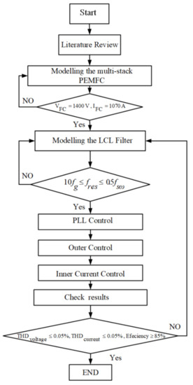 Figure 2 below depicts the research design flow used in this investigation. This research design flow shows the various steps undertaken in the design and simulation of the grid-tied multi-stack PEMFC to achieve the study’s objectives. The initial phase consisted of conducting a literature survey on PCUs types employed in systems powered from fuel cells and their control strategies. Based on the design specification, the next stage of the investigation consists of modelling the PEMFC to acquire a 1.54 MW at 1400 VDC. Once this phase is completed, the following step is the filter design to determine the grid and inverter sides’ inductances, the capacitor, and the damping resistance. The filter’s resonance frequency should be half of the switching frequency and ten times the grid frequency to avoid resonance caused by low and high harmonics ratings. If this condition is satisfied, the design of the inverter control can then be carried out. The inverter control scheme consists of regulating the frequency and the phase of the grid-tied multi-stack PEMFC through the phase-locked loop (PLL), then controlling the outer loop to produce the current reference in the dq0 reference frame, and at last designing the inner loop for the generation of the modulation signal. From this stage, a simulation can be carried to assess the total harmonic distortions of the voltage and the current and the grid-tied multi-stack PEMFC efficiency. The methodology’s final phase is to verify if the investigation’s primary goal, which is to realise total harmonic distortions of less than 0.5%, is achieved; otherwise, the filter must be redesigned.