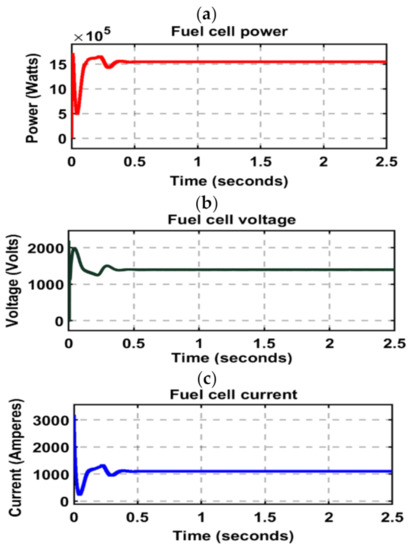 Figure 4 shows the fuel cell output power, voltage, and current. The steady-state values of the power, voltage, and current are 1.5 MW, 1400 V, and 1070 A, respectively. The multi-stack takes about 0.5 s to reach these steady-state values. The power response in Figure 4a has a rising time of 22.437 milliseconds, corresponding to the time needed for the power signal to rise from 0 to 100% of its final value. Furthermore, before getting into the steady-state, the signal displays an overshoot and an undershoot of 11.741% and 3.217%, respectively.