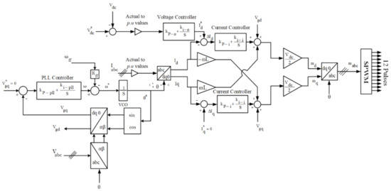 The inverter control primary function consists of adequately supplying the extracted power to the load connected at the inverter’s output or the grid if it is grid-tied. This function is realised by using a dual-loop control of the current. The outer control loop might be a DC-link voltage control or a power control loop producing the inner current references (Figure 5). In this study, the DC-link voltage is regulated to control the inverter power using an outer loop control. This voltage regulation provides the desired power transfer. DC voltage controller provides the current reference id_ref for the inner controller. The current reference is set to zero for the unity power factor. The following expression gives the energy stored in the DC-link capacitor: