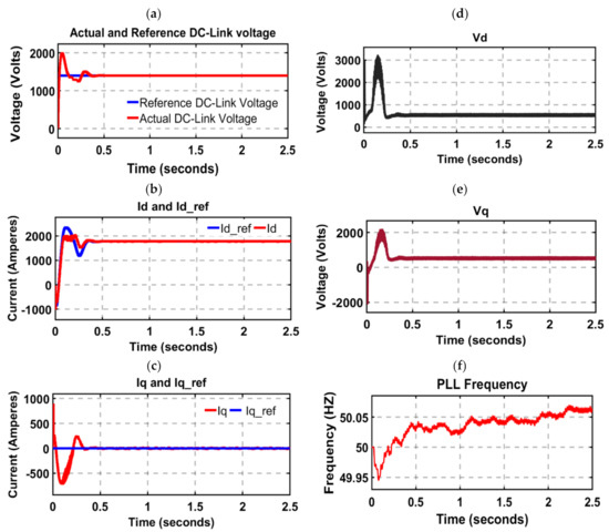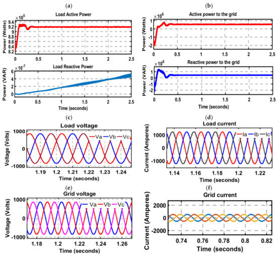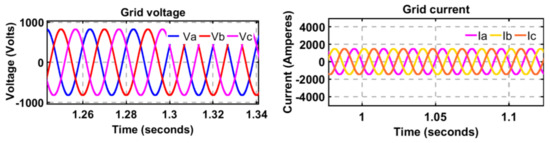 Additionally, the overshoot and undershoot of the voltage at the beginning of the simulation are 0.283% and 1.99%, respectively. The voltage and the current at the point of connection to the grid are depicted in Figure 11e,f. Their RMS values are 600 V between phases and 1105 A in a phase for the voltage and the current, respectively. The phase-to-phase voltage response has a rise time of about 5.577 milliseconds, while the fall time is 5.542 milliseconds. The overshoot and undershoot of the voltage are 11.932% and 2.779%, respectively.