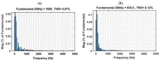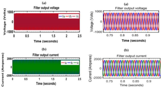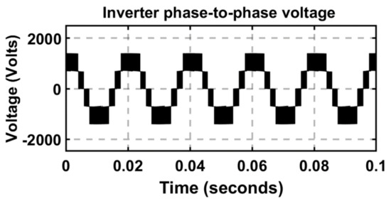 The phase-to-phase voltages and the phase currents at the low-pass filter’s output terminal are shown in Figure 11c,d. The phase voltages are pure sine waves of 600 V, and the phase currents are around 2334 A. The rise time of the voltage is 5.853 milliseconds, while the fall time is 5.857 milliseconds. The overshoot and undershoot of the voltage are 0.321% and 1.984%, respectively. The phase current’s rise time is about 5.855 milliseconds, while the fall time is 5.856 milliseconds.