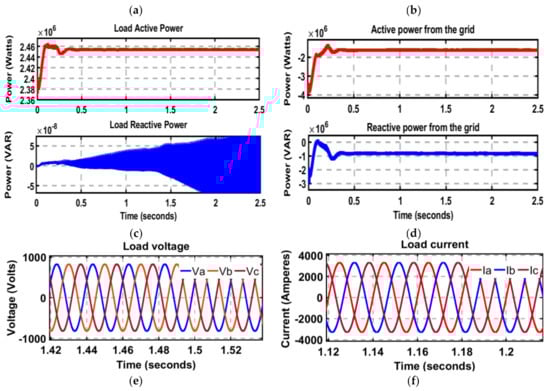 This case study considers a load of 2.5 MW connected at the grid-tied fuel cell inverter’s output terminals. The system imports the grid’s power to meet the 2.5 MW load since the fuel cell can only produce 1.54 MW. Because the inverter’s efficiency is 88%, the load can only receive approximately 1.23 MW from the grid-tied inverter, and any deficit must come from the grid. The active and reactive power curves measured at the load’s output terminals are shown in Figure 11a. The active power’s value is 2.5 MW, while the reactive power varies around zero (1.865e-7 VAR). The active power signal is characterised by an overshoot of 14.557% between t = 0 and t = 0.3 s and an undershoot of 1.998% between t = 0.3 and t = 0.4 s. After that, this response stabilises to reach the steady-state value of 2.5 MW. On the other hand, the reactive power displays an overshoot of 95.419% around t = 2 s, whereas the undershoot is 40.092%.